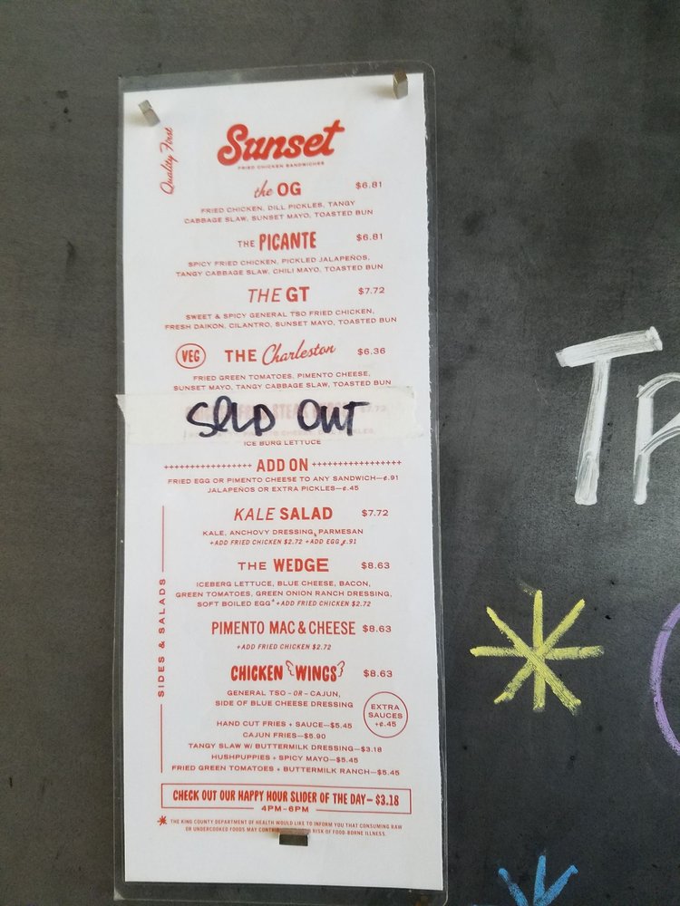 Welcome to Sunset Fried Chicken Sandwiches, a culinary gem nestled in Rachel's Ginger Beer on Seattle's Capitol Hill. This spot specializes in New American fried chicken sandwiches that promise to delight your taste buds. With a concise menu featuring options like The Picante and The O.G., each sandwich is crafted with love, showcasing crispy, juicy dark meat enveloped in a fresh, toasted bun.